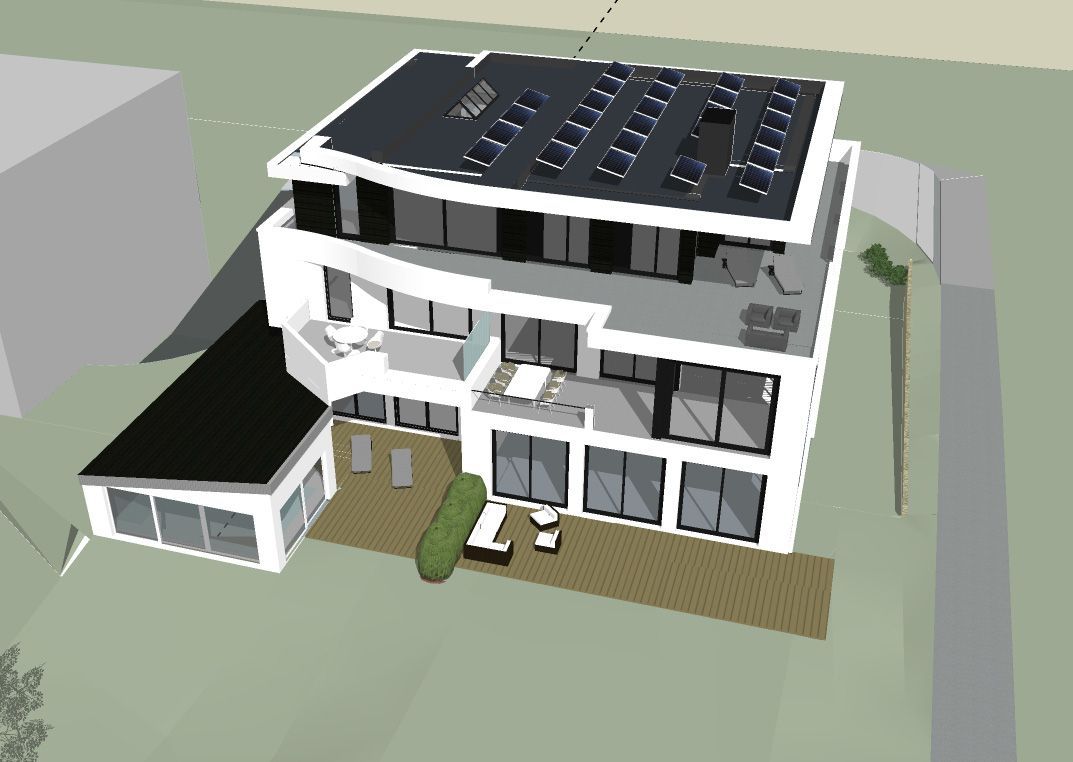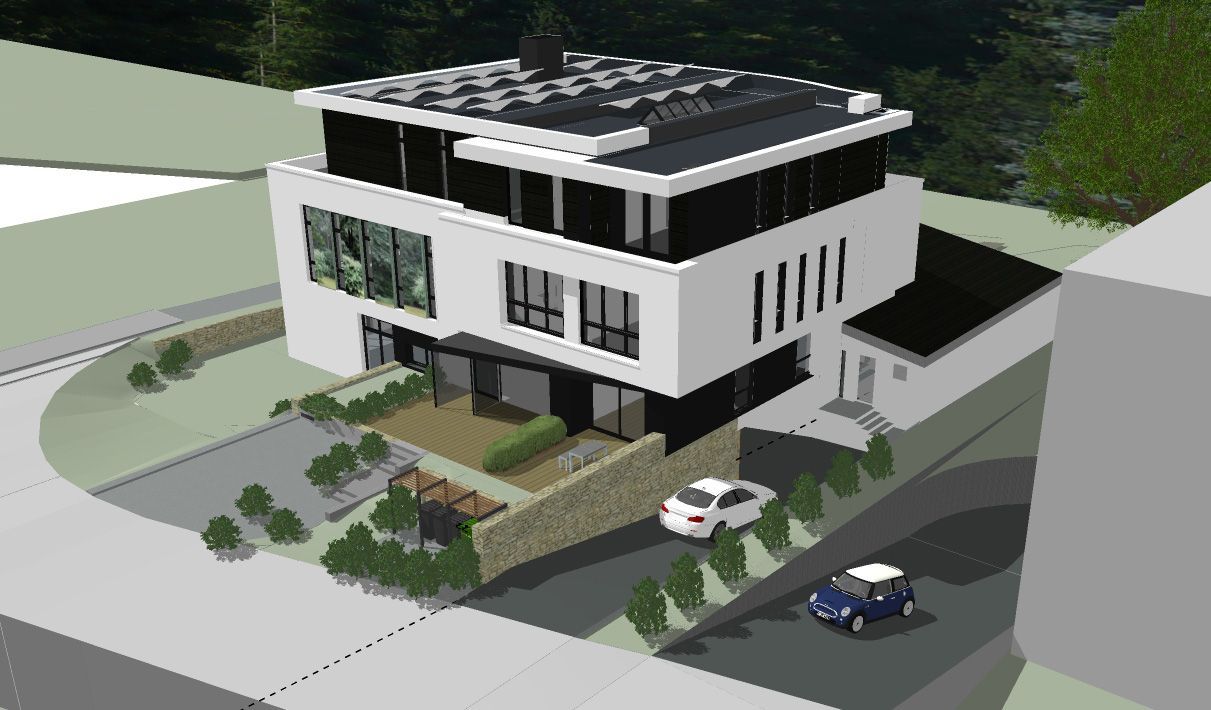 Die leichte Hanglage ermöglicht auf der Gartenseite ein zusätzliches halbes Geschoss. Die gezeigte 3D-Animation vermittelt einen Eindruck der räumlichen Staffelung.